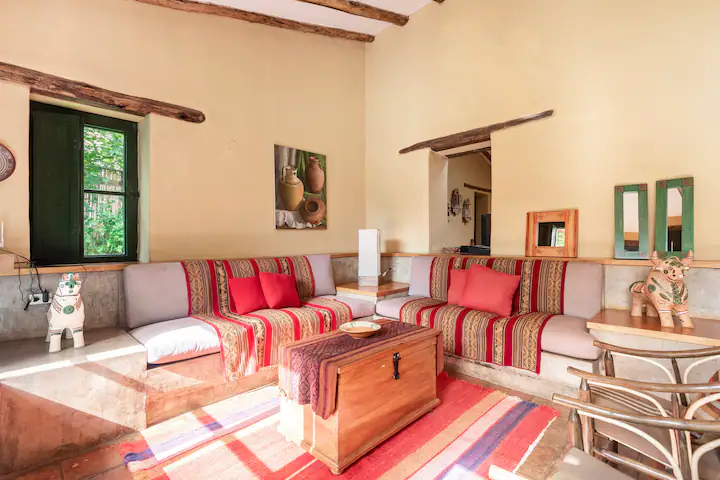 Decorated in vibrant local textiles and handicrafts, the home features four bedrooms with ten beds across shared rooms, each with a private ensuite bathroom. There are also two spacious common areas centered around a cozy fireplace where we can relax and integrate experiences.
